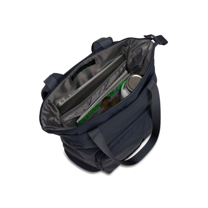 The convertibility of this tote is where it shines. When you want to lighten your load, un-stash the shoulder straps and wear it as a backpack. It has a soft, anti-scratch pocket for your shades or phone, and easily carries your 16" laptop. Outside pocketing keeps a kombucha or baguette at the ready.